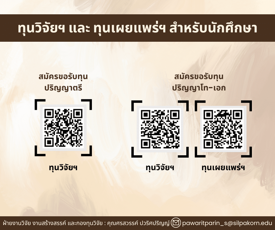 - ประกาศคณะดุริยางคศาสตร์ มหาวิทยาลัยศิลปากร เรื่อง การรับสมัครทุนอุดหนุนการวิจัย นวัตกรรมและการสร้างสรรค์ สำหรับนักศึกษาคณะดุริ